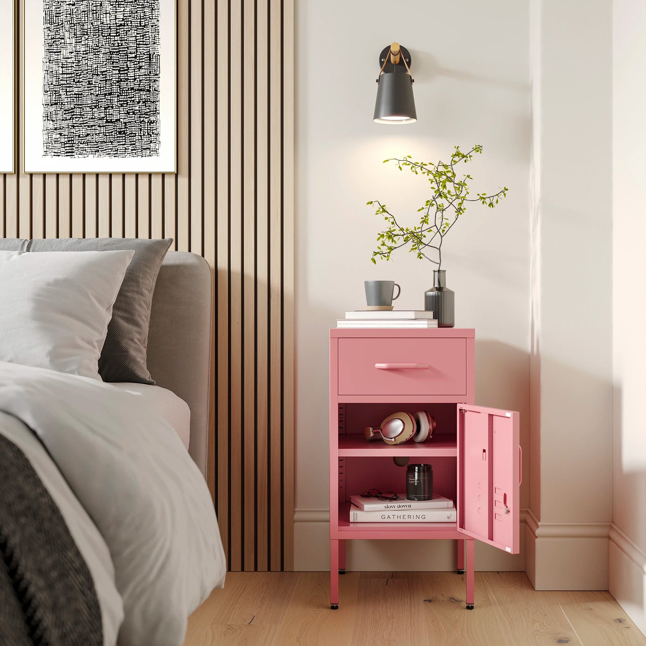 The Chelsea tall double-door metal storage locker and The Camden side table locker both in slate grey, next to each other in a bedroom