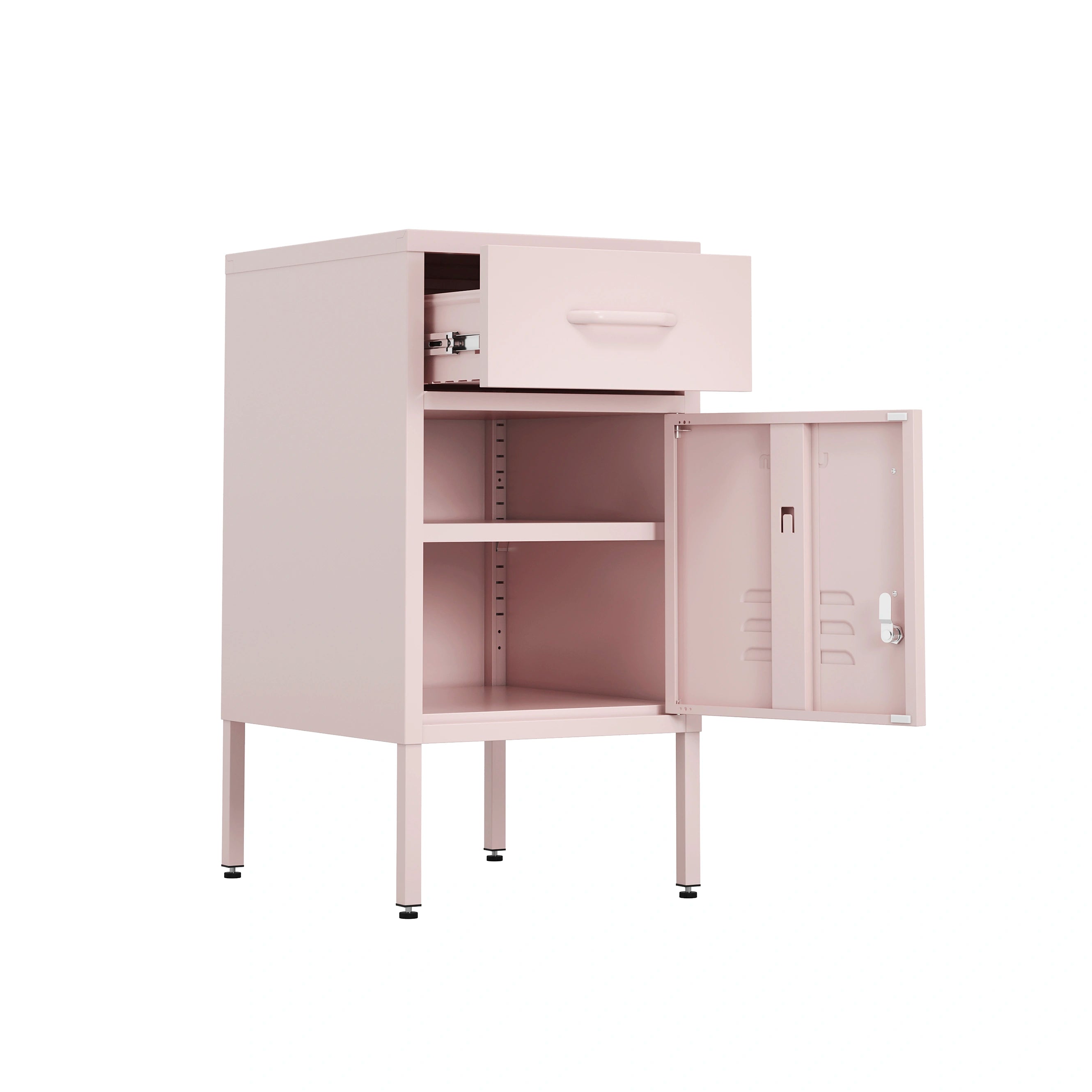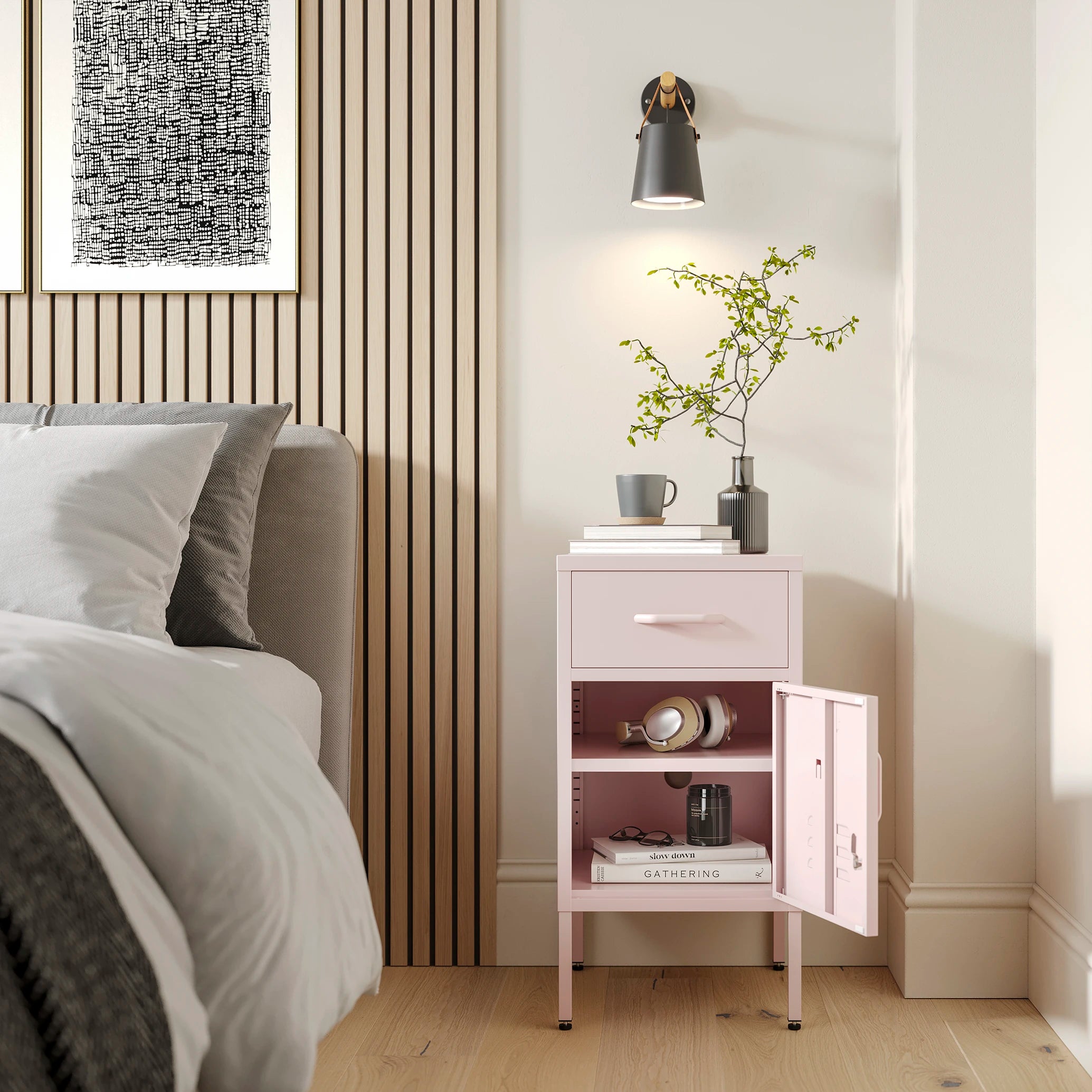 Metal side table locker in light pink with one drawer and one door, in a room next to a bed