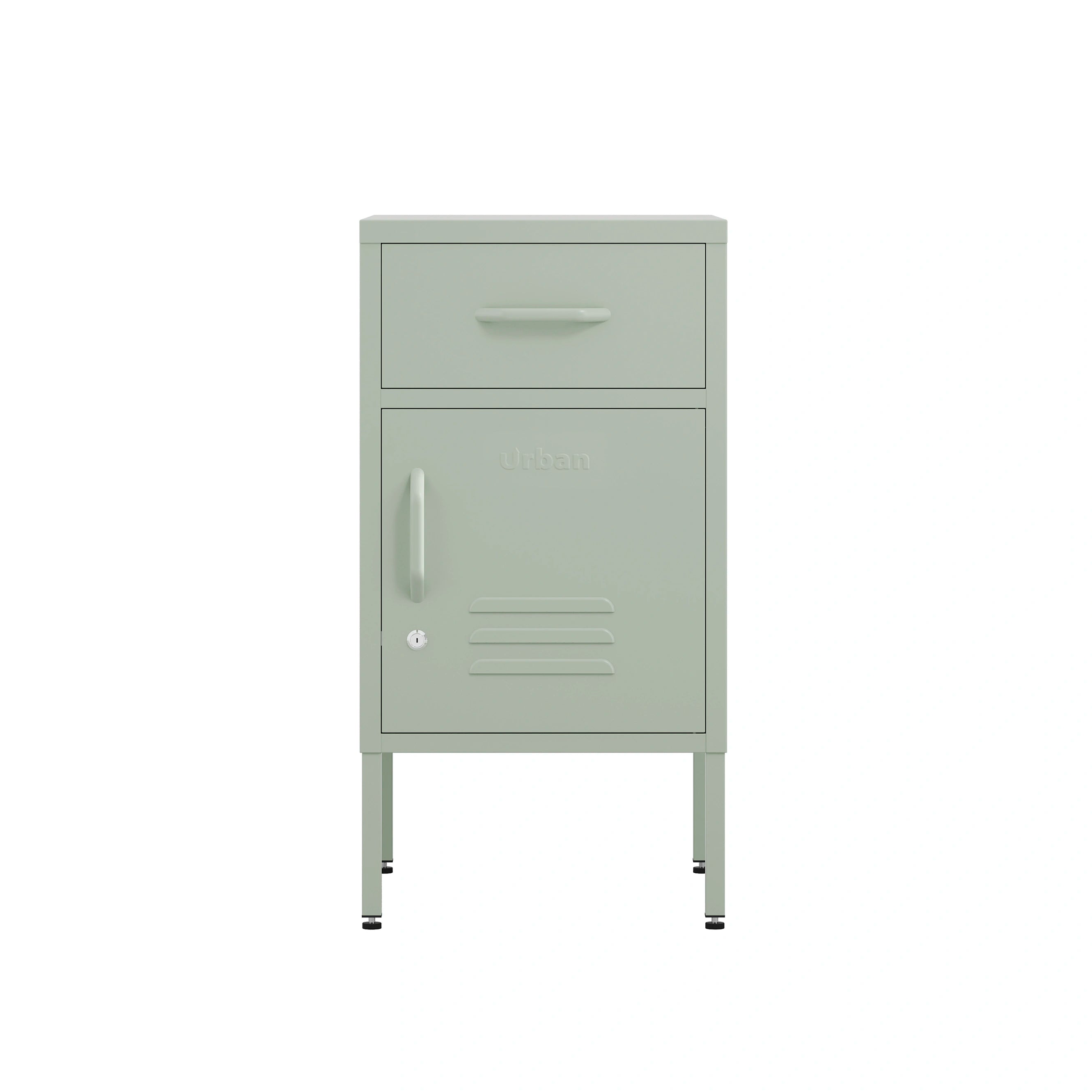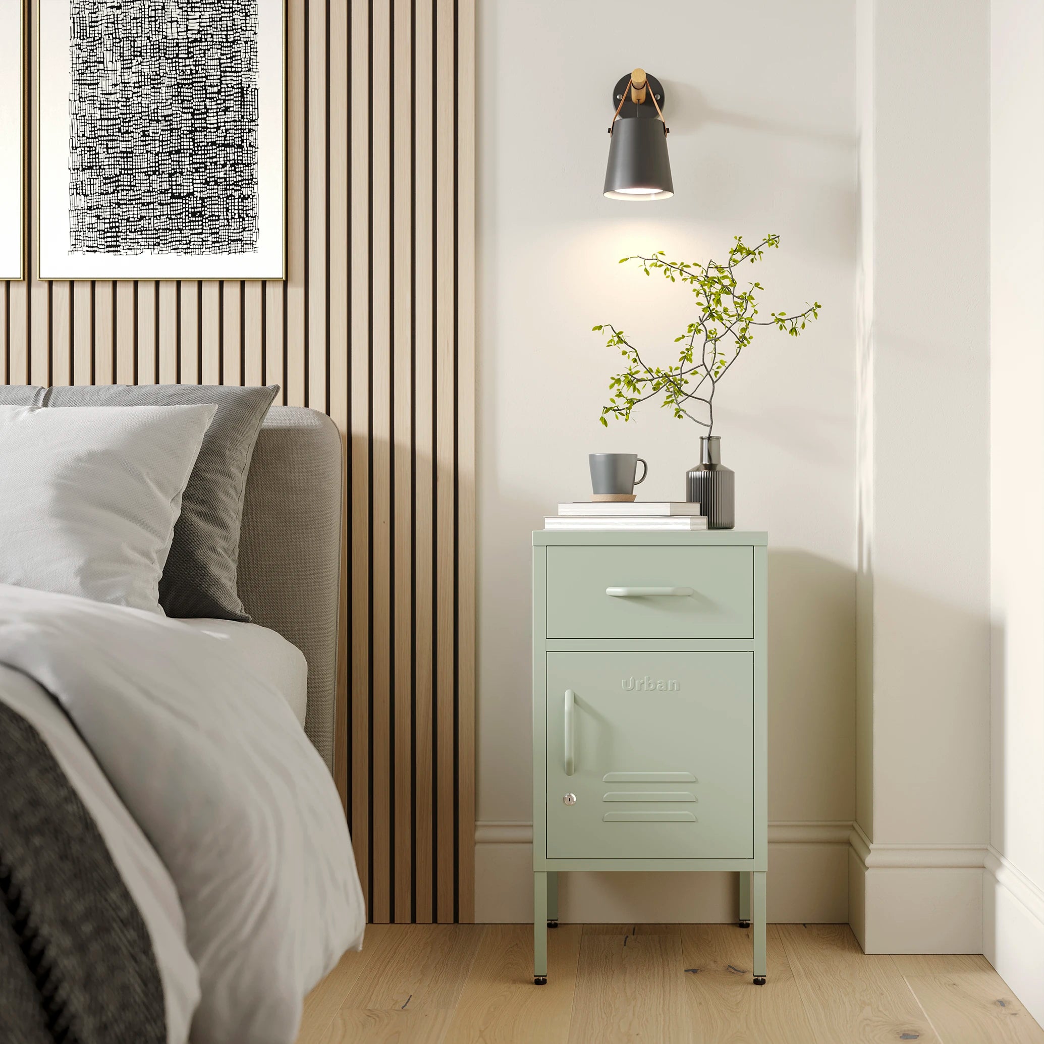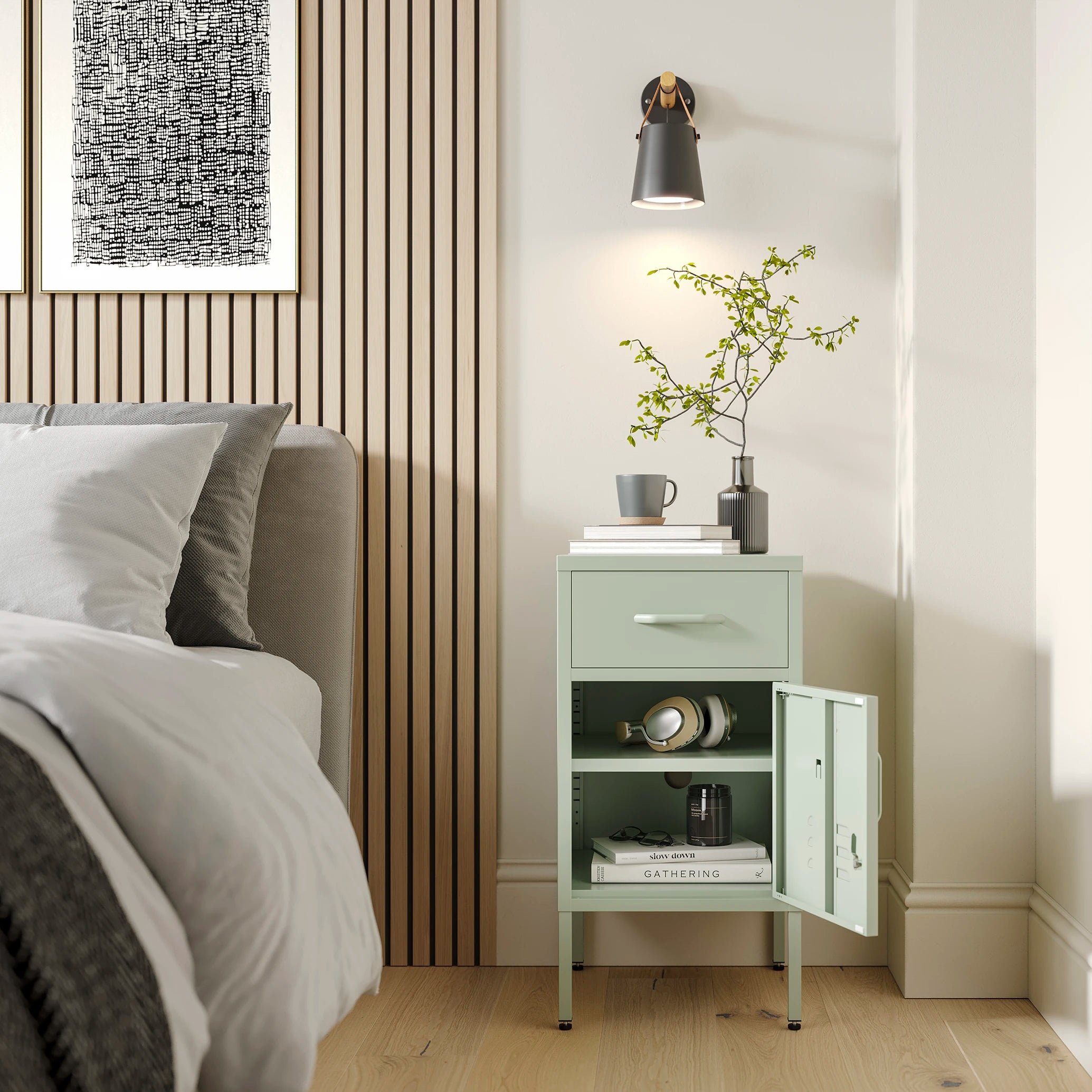 Metal side table locker in sage green with one drawer and one door, in a room next to a bed