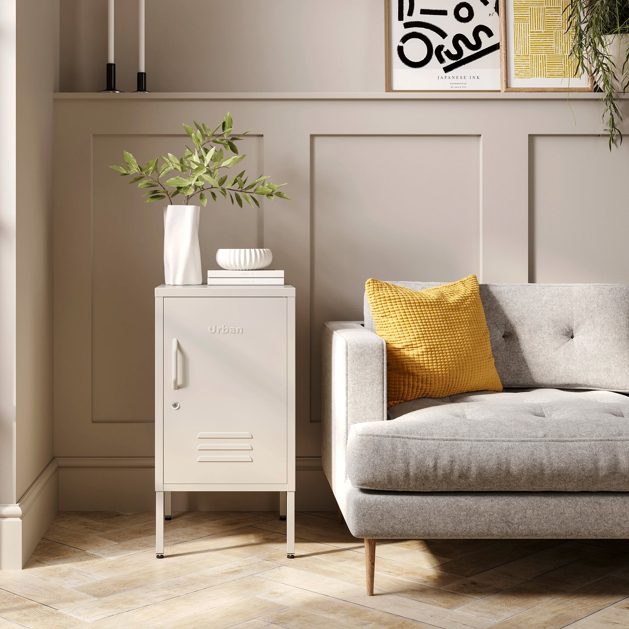 The Camden vanilla metal storage locker as a side table next to a sofa