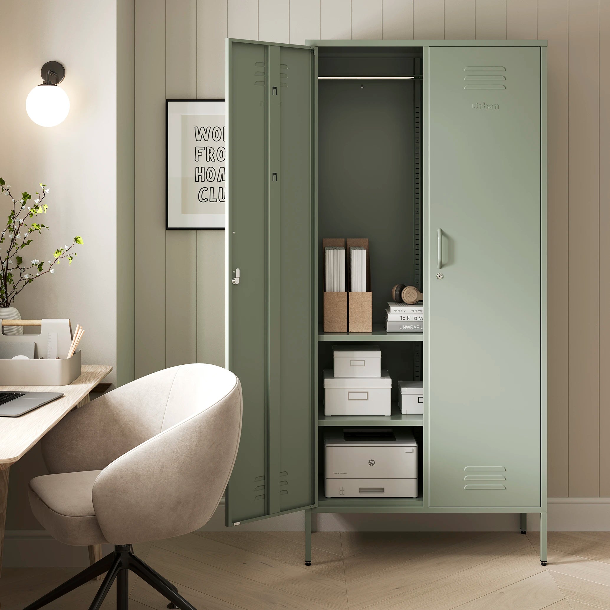 The Chelsea tall double-door metal storage locker in sage green in a room