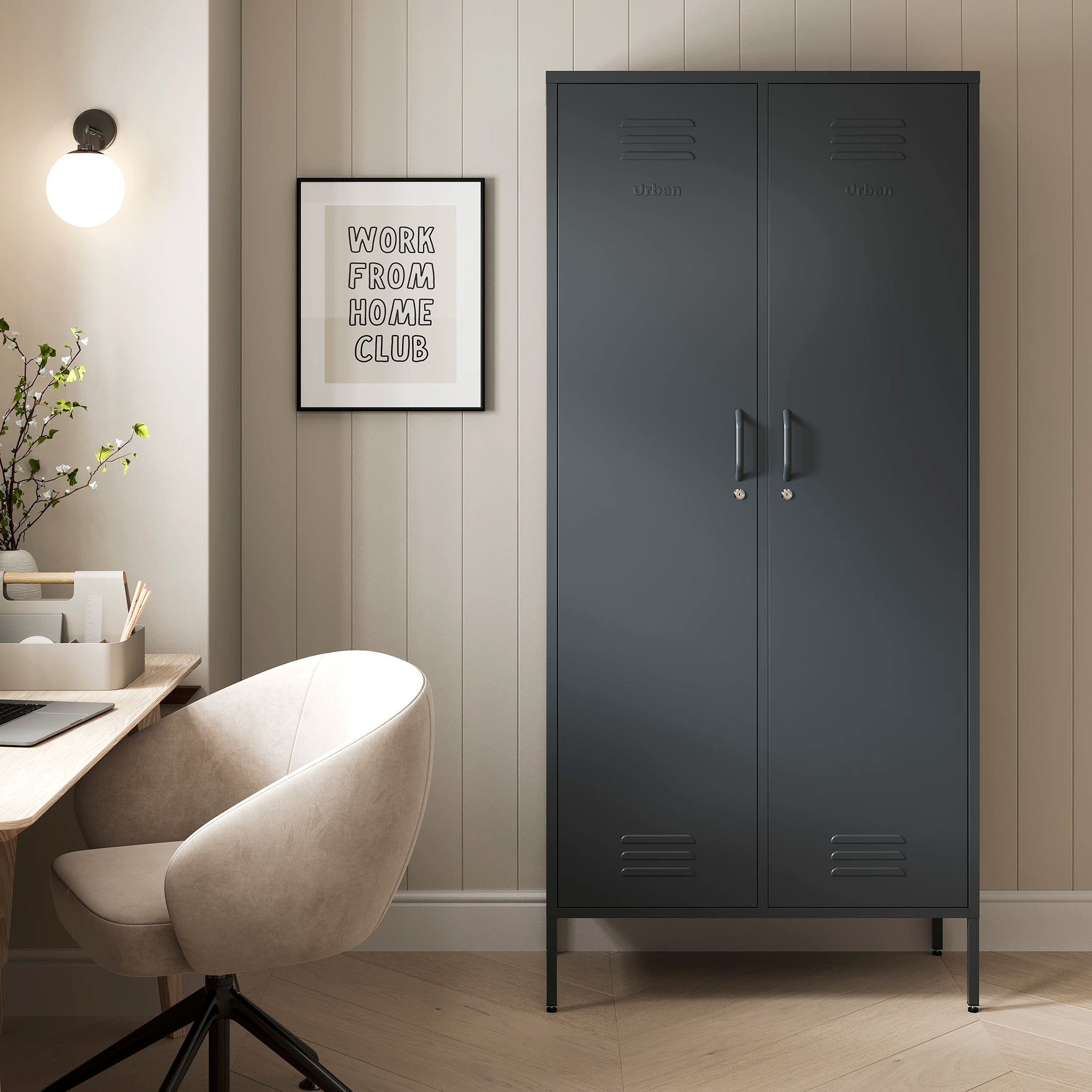 Add a classic feel to your home with the Slate Grey Chelsea locker. This two-door Slate Grey locker wardrobe combines spacious storage with sleek aesthetics, making it a versatile addition to any room. Its neutral Slate Grey finish effortlessly complements both modern and classic interiors, offering a clean, minimalist look. With its lockable doors for added security, this wardrobe locker is perfect for organising clothing, accessories, or household essentials and makes the perfect bedroom locker. Add a statement piece to your bedroom with The Chelsea Slate Grey locker.