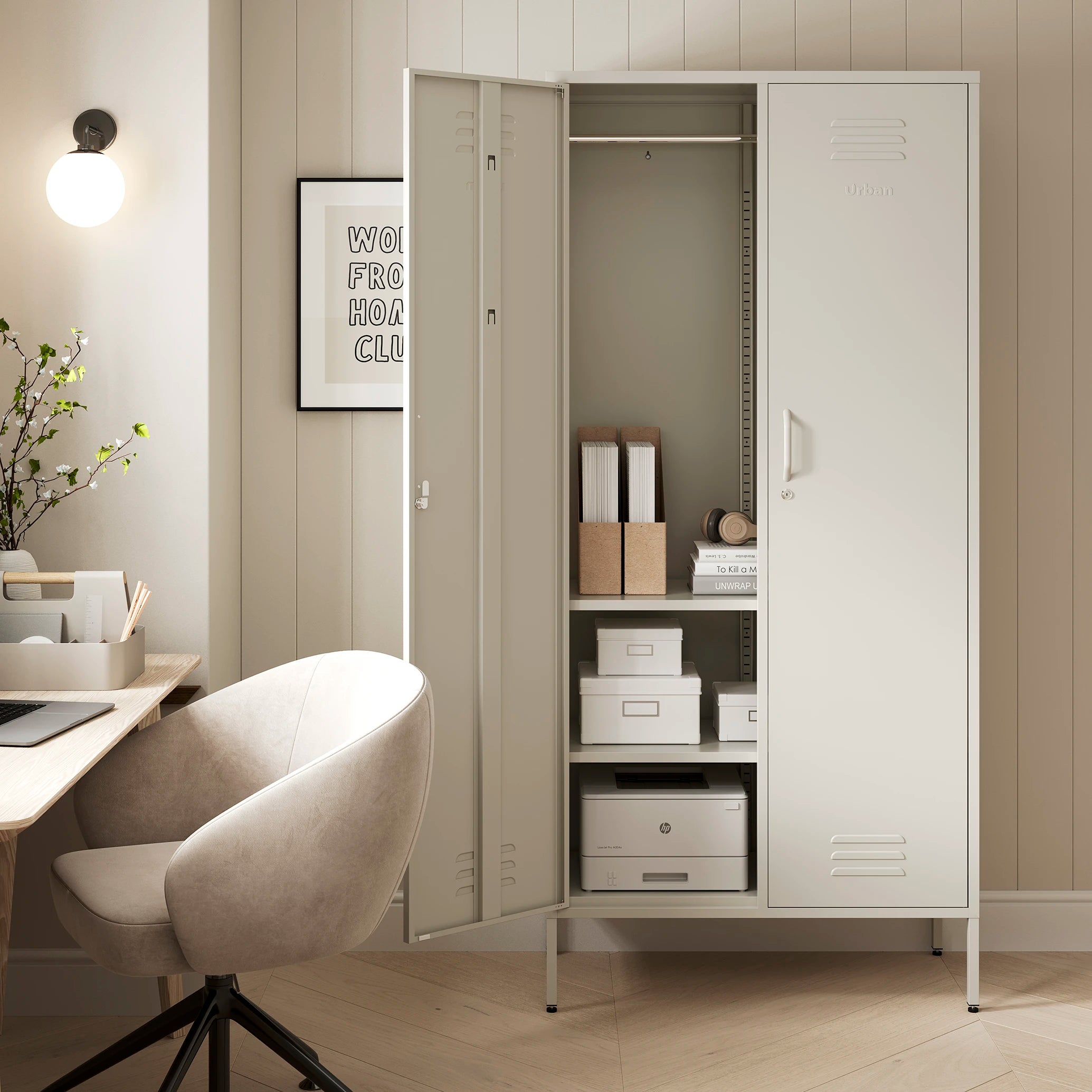 The Chelsea tall double-door metal storage locker in vanilla in a room