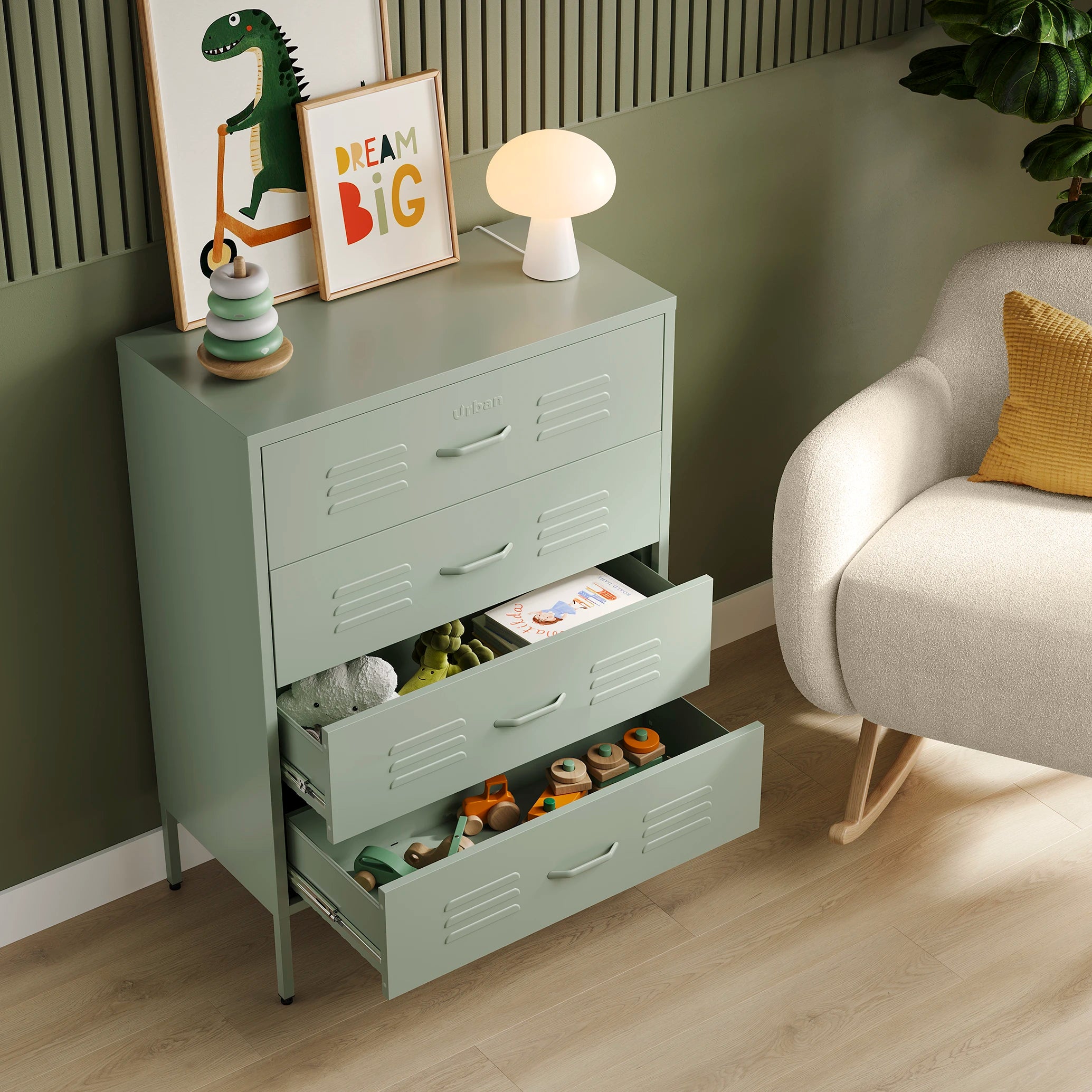 The Harrow metal drawers in sage green with 4 drawers, 2 of them open showing toys inside