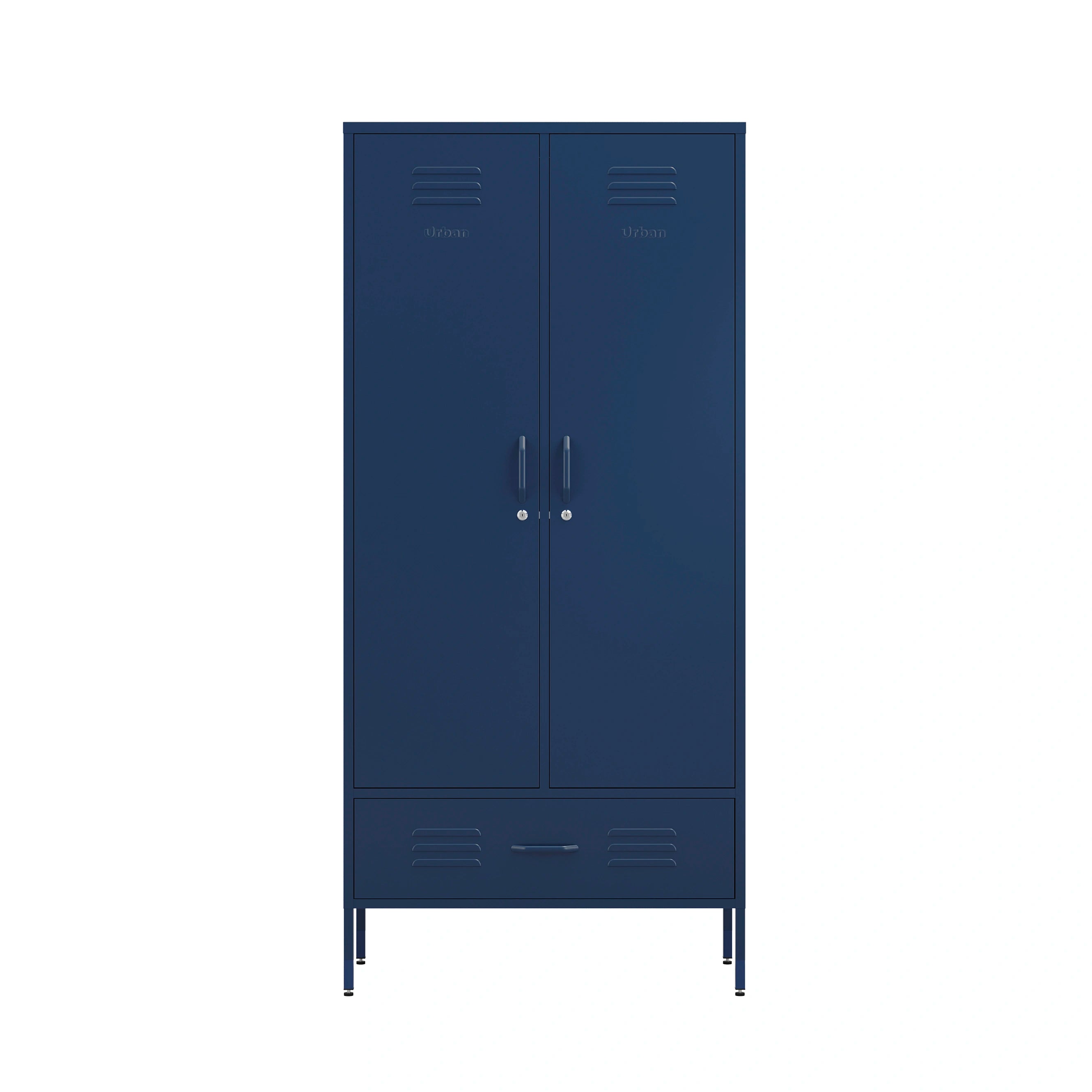 Metal, tall, double-door and single-drawer storage locker in navy blue, in a bedroom