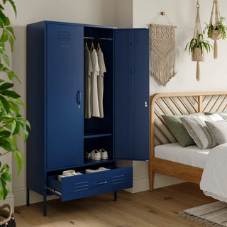 The Bexley single-door tall storage locker and a metal storage locker with 2 doors and 2 drawers, both in navy blue next to each other in a room
