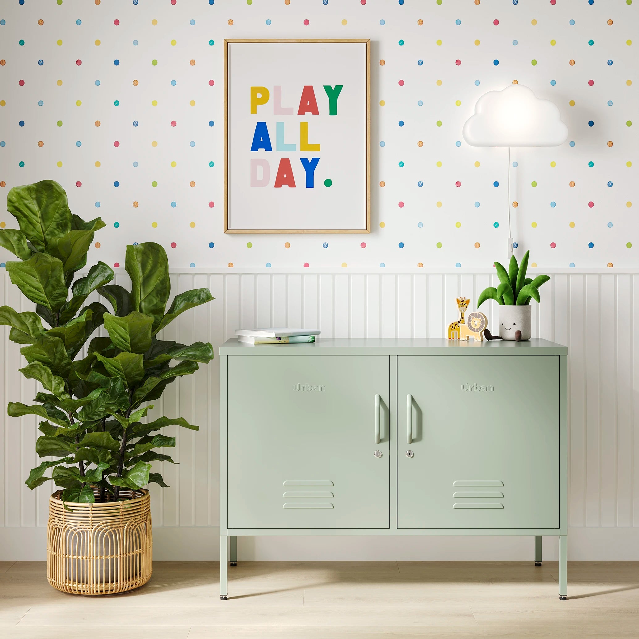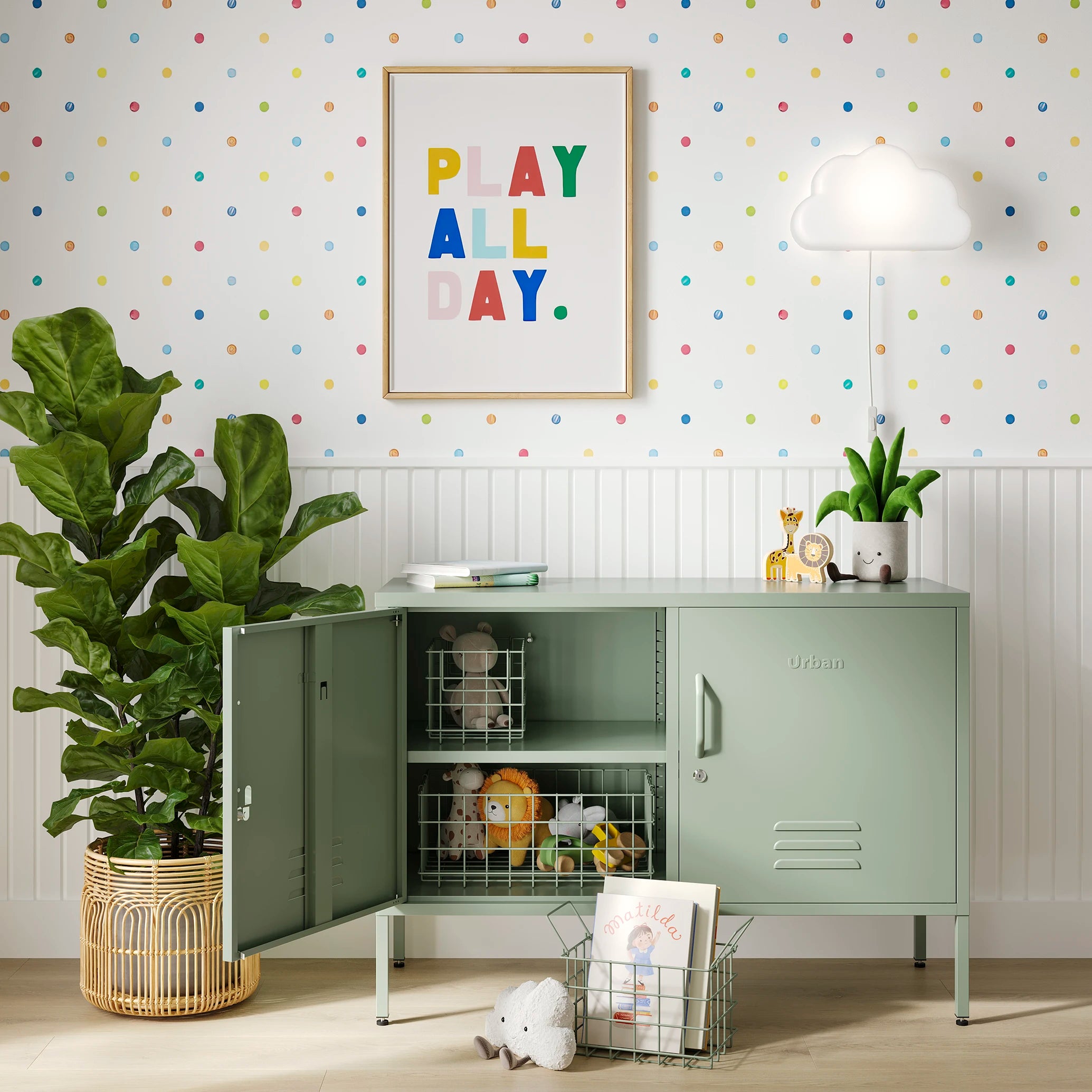 The Oxford metal storage locker in sage green with two doors, with books and toys on top
