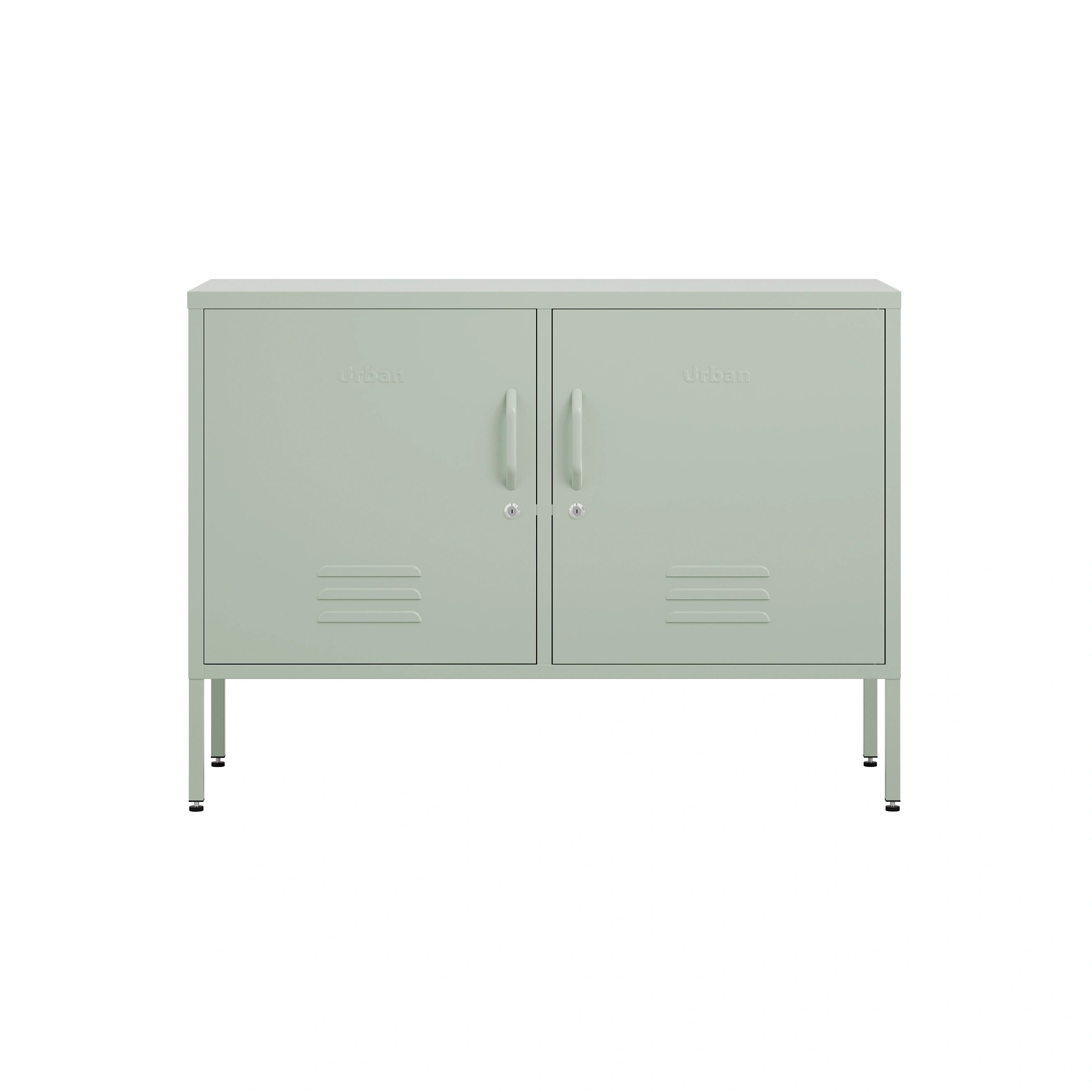 The Oxford, a wide, short 2 door metal locker in sage green.