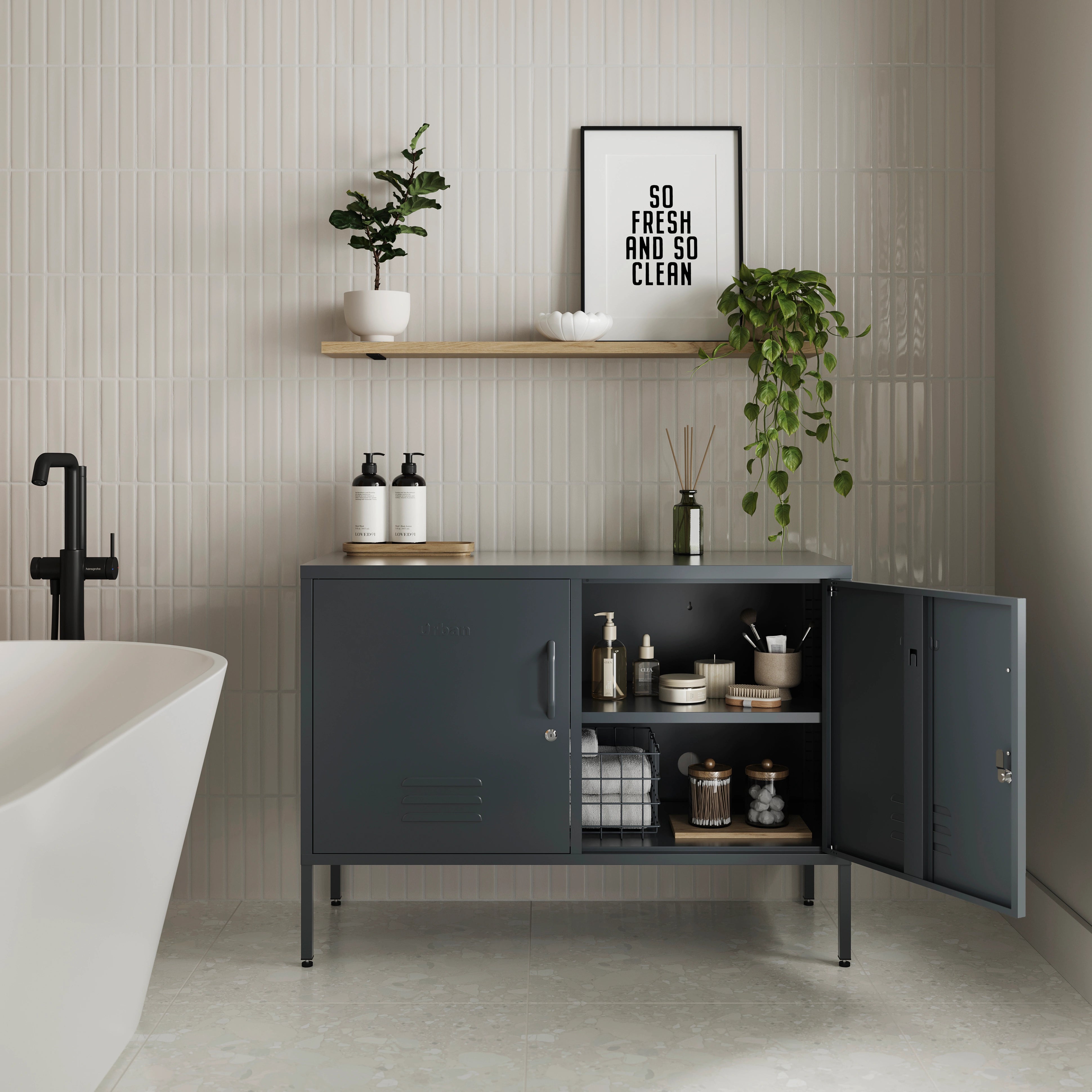 The Slate Grey Oxford is a wide, short, two-door locker combines practicality with style in abundance. This minimalist Slate Grey locker is versatile and functional, providing lots of storage without taking over your space. Whether you're looking for a TV stand, bathroom cabinet, or office storage, the Slate Grey Oxford fits right in. With cable holes in the back and adjustable shelves, its sleek design fits right in anywhere while keeping your essentials neatly out of sight. Additional features include a magnetic surface, handy hooks, wall mounting holes, and adjustable feet for extra flexibility and function.